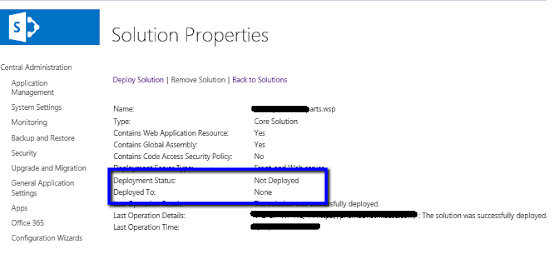 - Finally, redeploy the Solution either using PowerShell or Via Central admin.